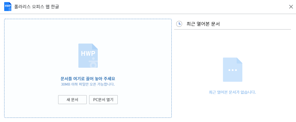 창을 자세히 보시면 새문서, pc문서 열기 버튼이 보이시는데 pc 문서 열기를 클릭하시면 hwp 파일 열기가 가능합니다.
