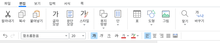 보시면 글자모양, 문자모양, 글자 스타일, 잘라내기, 붙여넣기, 표, 도형 등의 메뉴가 보이실텐데 한글 프로그램과 비슷하게 구성되어 있습니다.