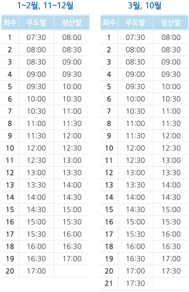 우선 우도배시간표는 월에 따라 달라지며 성산항기준으로 시간표를 설명드리겠습니다. 먼저 1~2월 11~12월, 3월, 10월 우도 배시간표입니다.