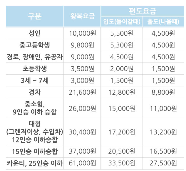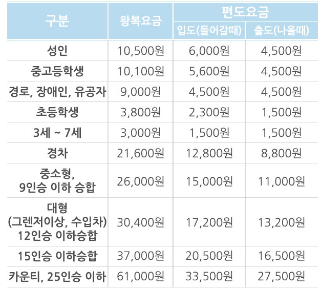 성인 기준 왕복요금 10,500원, 중고등학생 10,100원, 경로, 장애인, 유공자 9,000원, 초등학생, 3,800원, 3~7세 3,000원입니다.