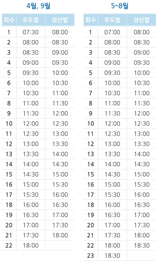 4, 9월, 5~8월 우도 배시간표입니다. 우도발 1회수가 07시 30분, 성산발 8시라고 되어 있는데 우도발이란 우도에서 출발하는 것을 말하하고 성산발은 성산에서 출발하는 것을 말합니다. 그러니 만약에 우도로 가려고 한다면 성산발을 탑승해야하고 8시에 탑승을 해야겠죠.