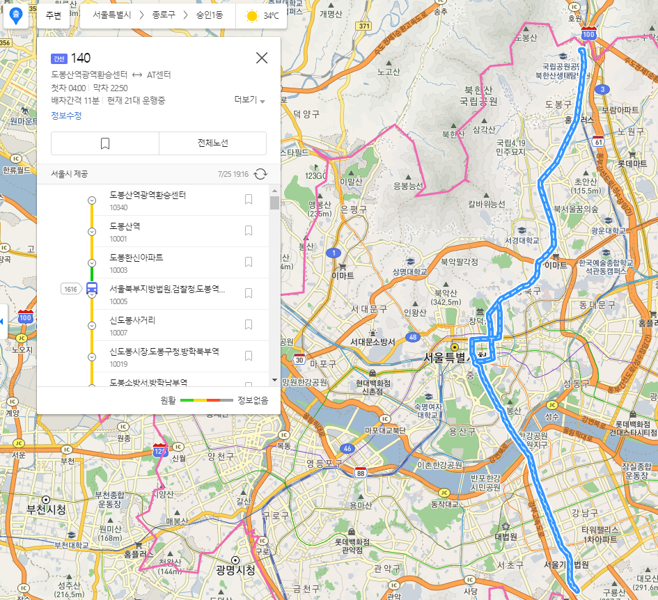 140번 간선버스는 도봉산역광역환승센터에서 AT센터까지 가는것으로 되어 있습니다.