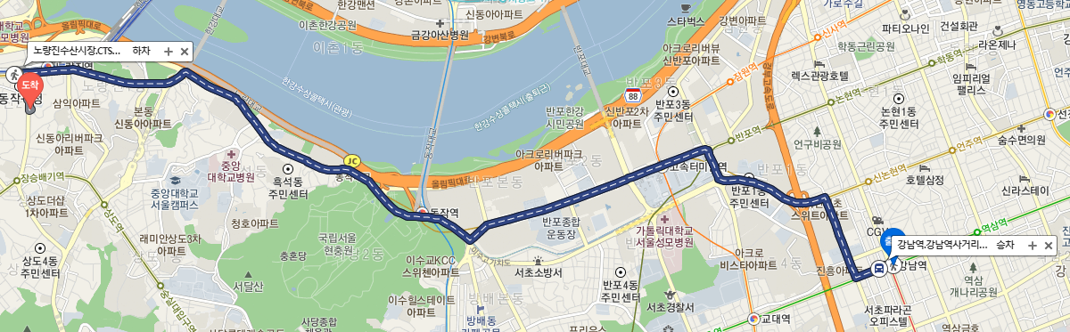 만약에 강남역 2호선에서 노량진동으로 가려고 하는데 몇번 버스를 타야하는지 모른다고 가정해보겠습니다.