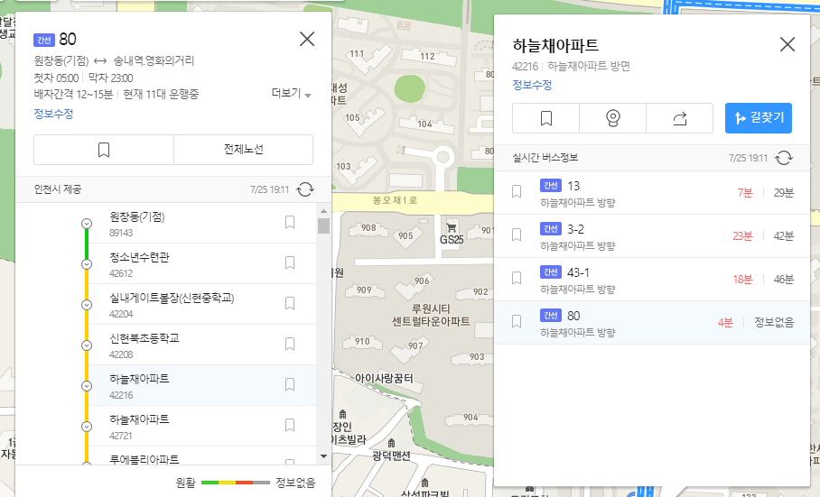 클릭하고나니 현재 80번 버스는 계산우체국에 있고 2정거장을 지나고나면 하나아파트에 도착한다고 되어 있습니다.