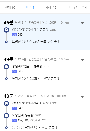 클릭하시면 이렇게 강남역에서 노량진동으로 가는버스를 확인하실 수 있습니다.