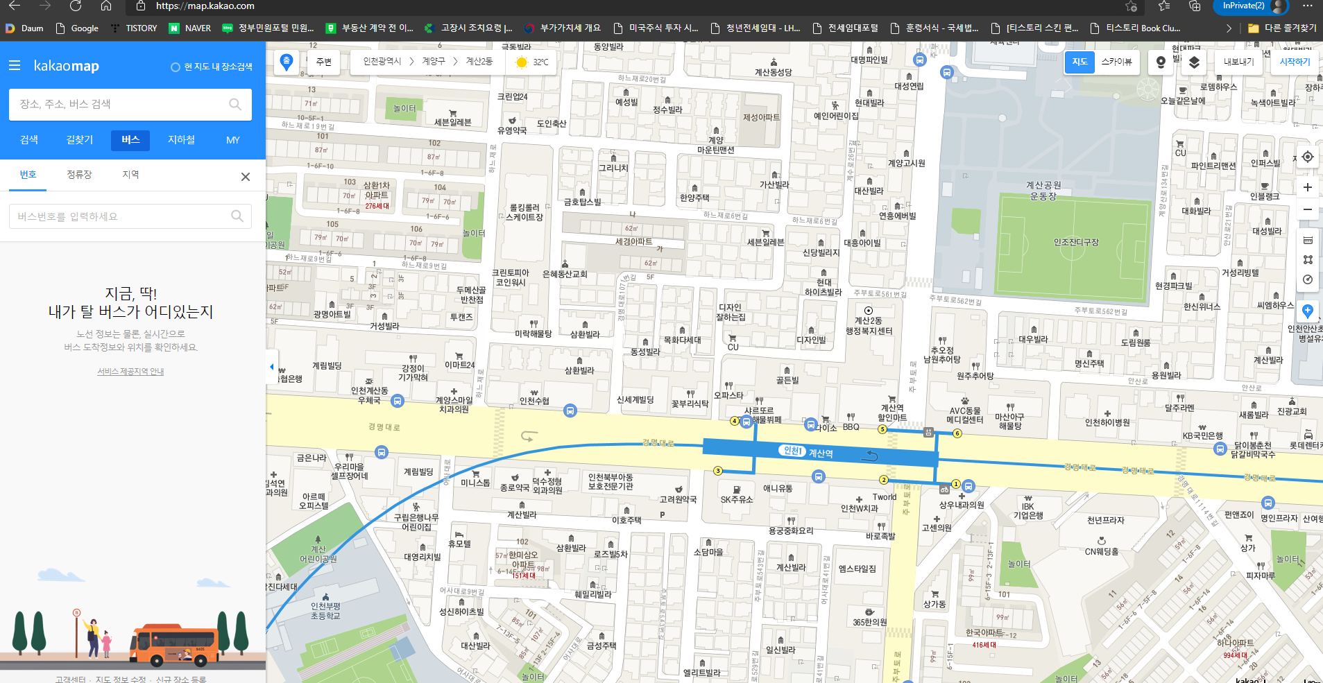 처음 카카오맵을 여니 인천계산역으로 되어 있는데 계산역에 사시는 분들을 위해서 먼저 버스 노선 검색을 해보겠습니다.