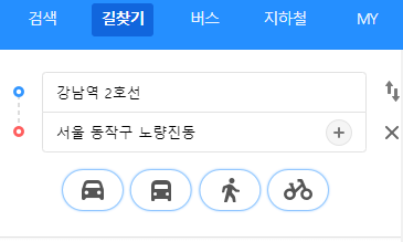 카카오맵 왼쪽을 보시면 길찾기가 보이실 것입니다. 출발지는 강남역 2호선, 도착지를 노량진동으로 선택해보겠습니다.