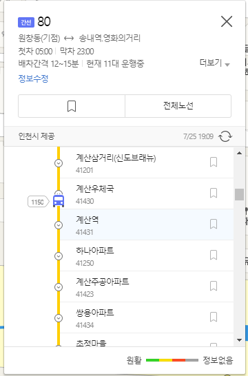 클릭하고나니 현재 80번 버스는 계산우체국에 있고 2정거장을 지나고나면 하나아파트에 도착한다고 되어 있습니다.