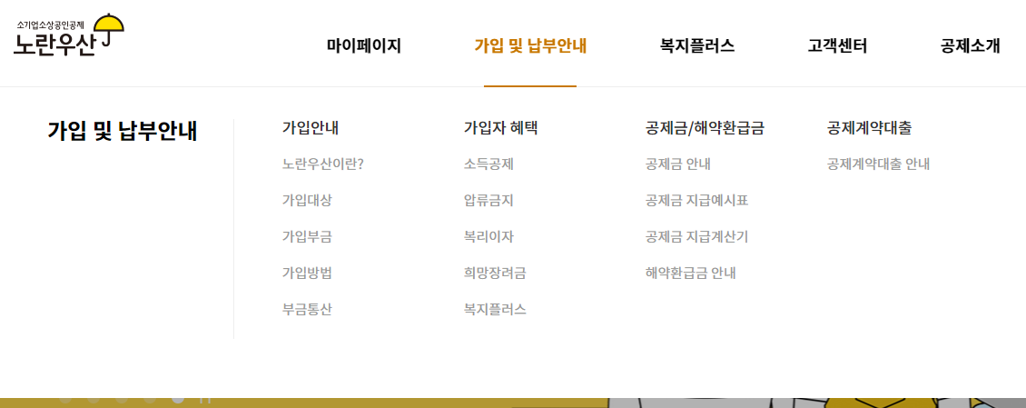 상단 메뉴들 중에서 가입 및 납부 안내를 보시면 노란우산이란 무엇인지, 노랑 우산 가입대상은 누구인지, 가입방법은 어떻게 되는지 등이 설명되어 있습니다.