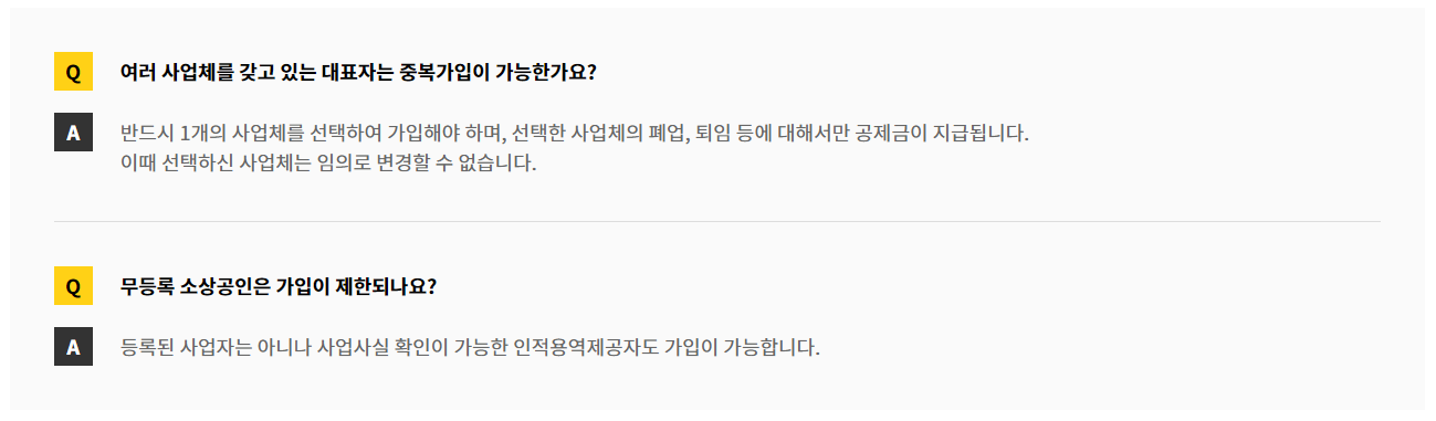 여러 사업체를 갖고 있는 경우 대표자는 중복가입이 불가능하며 무등록 소상공인도 가입이 제한되지는 않고 사업사실 확인이 가능한 인적용역제공자도 가입이 가능합니다.