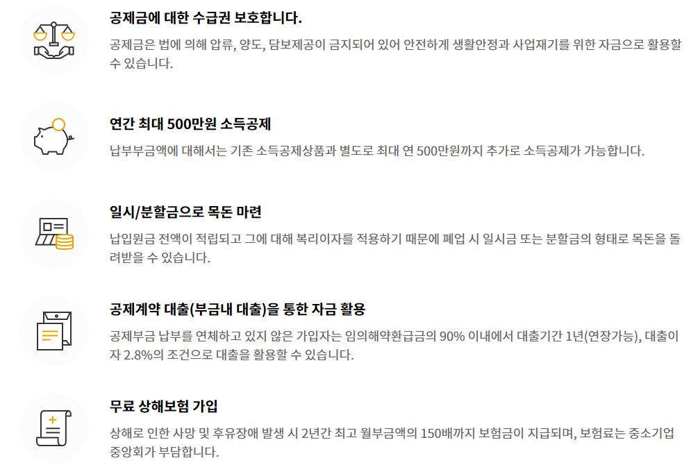 연간 최대 500만원 소득 공제, 목돈 마련, 자금활용, 공제금에 대한 수급권 보호 등입니다.