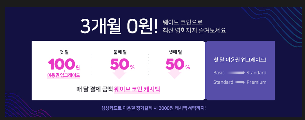 현재 웨이브에서는 첫달 100원, 돌재딸 50%, 셋째달 50%를 진행중인데 관심있으신분들은 한번 접속하셔셔 확인해보시기 바랍니다.