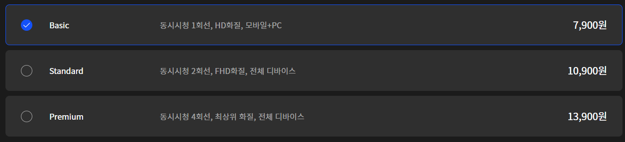 basic 요금제는 동시시청 1회선, hd 화질, 모바일+pc 시청가능이며 7,900원, standard 요금제는 동시시청 2회선, fhd 화질, 전체 디바이스 시청가능합니다.