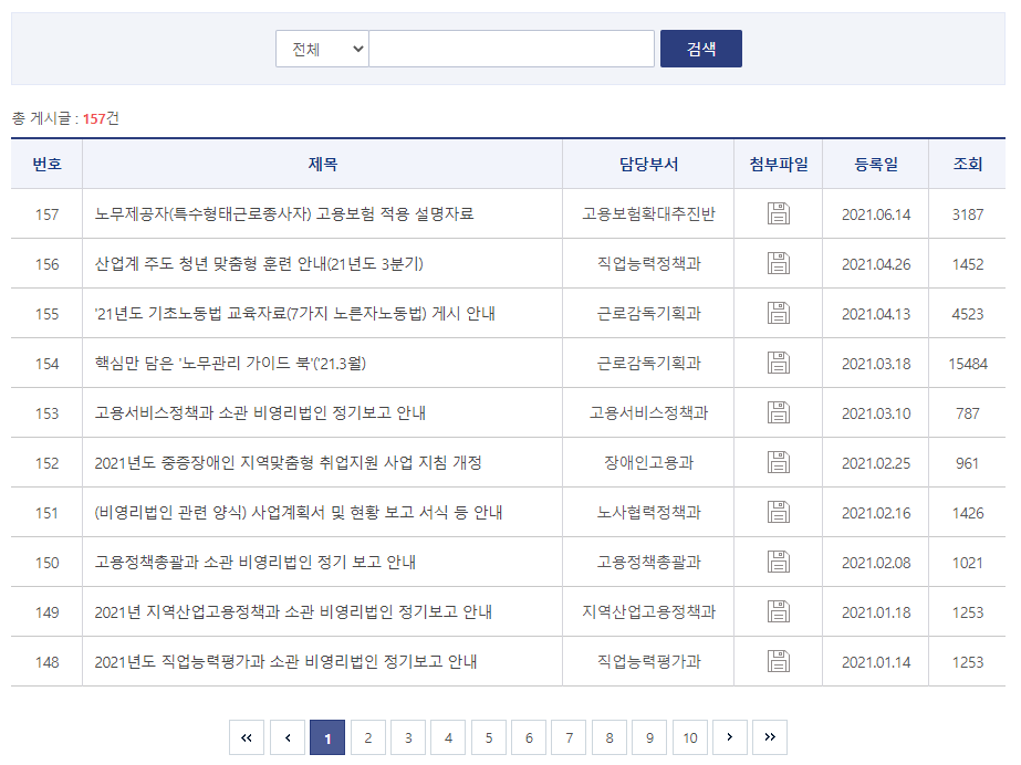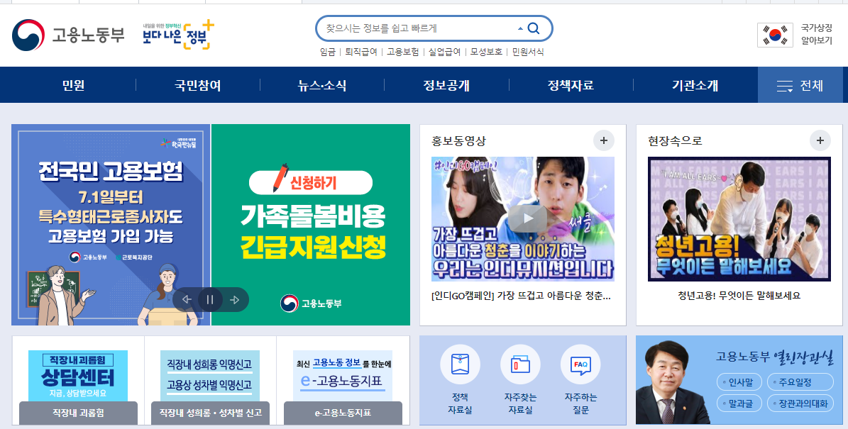 고용노동부 홈페이지에 접속하셔서 상단에 메뉴들을 보시면 민원, 국민참여, 뉴스, 소식, 정보공개 등이 보입니다.