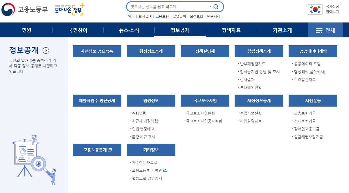 정보공개 메뉴에는 사전정보, 고용노동통계, 기타정보 등의 메뉴들이 있습니다.