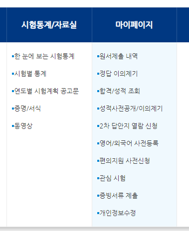 홈페이지에 접속하셔서 위쪽을 보시면 시험안내, 원서접수, 시험문제/정답, 서류전형/ 면접시험 등이 보입니다.