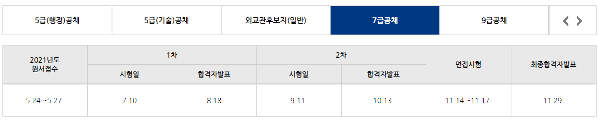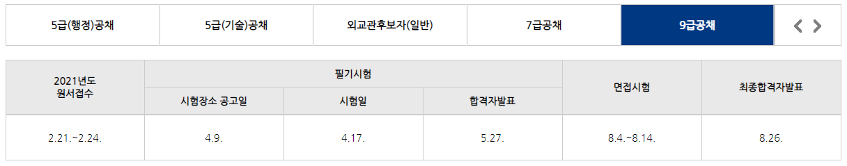 9급 공채 외에 7급공채, 5급(기술)공채, 5급(행정)공채, 외교관 후보자(일반)의 원서접수 기간, 시험일, 합격자 발표일, 면접시험 기간, 최종 합격자 발표 날짜도 확인하실 수 있습니다.