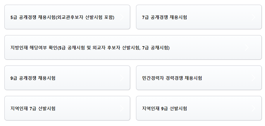 9급 공채 외에 7급공채, 5급(기술)공채, 5급(행정)공채, 외교관 후보자(일반)의 원서접수 기간, 시험일, 합격자 발표일, 면접시험 기간, 최종 합격자 발표 날짜도 확인하실 수 있습니다.