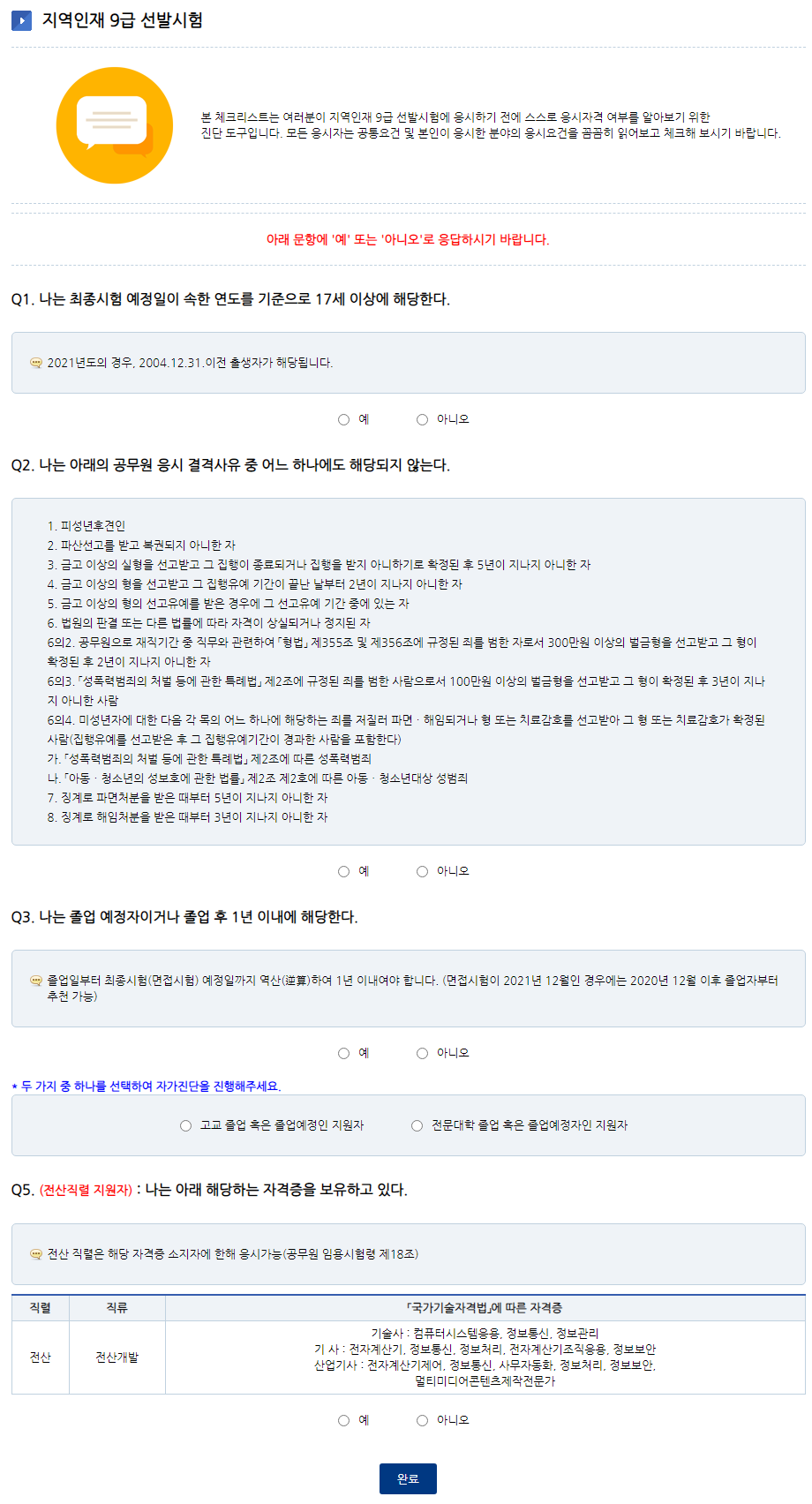 클릭하니 최종 시험 예정일, 결격사유, 졸업 여부, 자격증 보유여부를 선택하게 됩니다. 전산직렬을 자격증 소지자에 한해 응시가 가능하니 전산직렬에 응시하려는 경우 자격증을 먼저 취득하셔야 합니다.