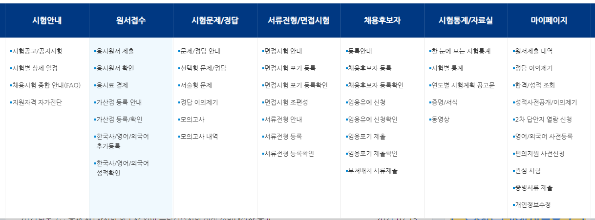 홈페이지에 접속하셔서 위쪽을 보시면 시험안내, 원서접수, 시험문제/정답, 서류전형/ 면접시험 등이 보입니다.