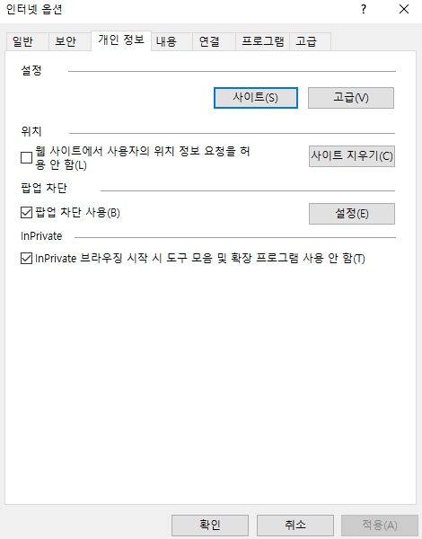 위쪽을 보시면 일반, 보안, 개인정보, 내용, 연결 등이 보이는데 개인정보를 클릭하시기 바랍니다.