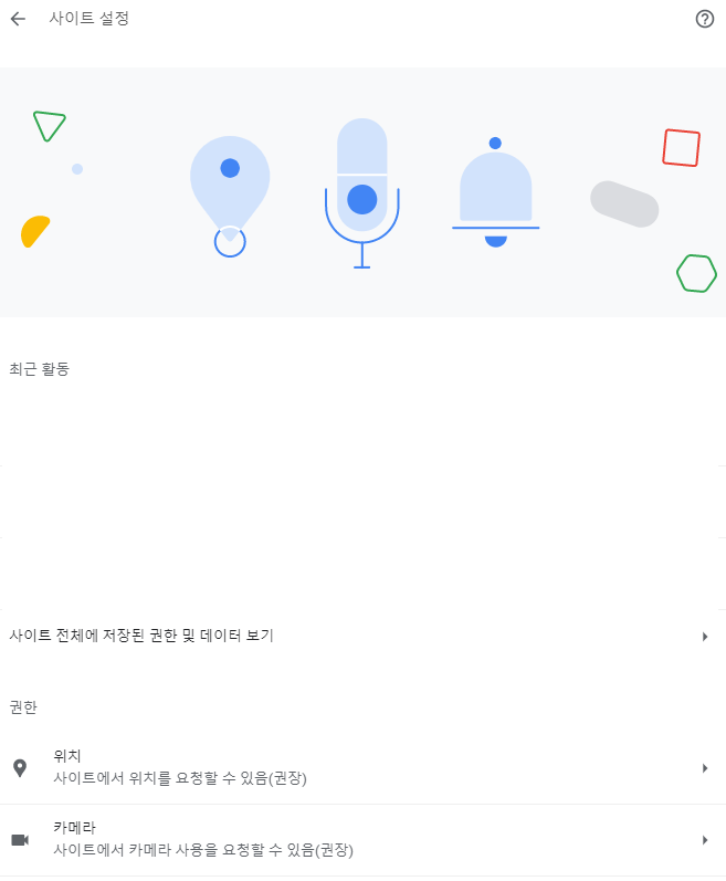 아래쪽에 보이는 사이트 설정을 보시면 위치, 카메라, 팝업 등이 보이실텐데 사이트설정을 클릭하시기 바랍니다.