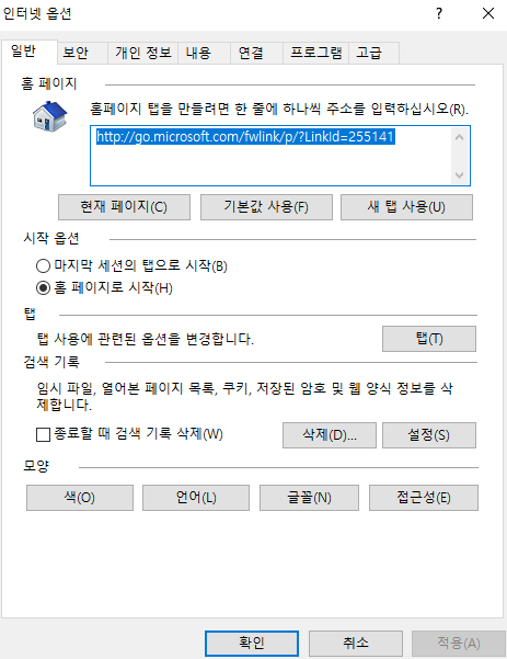 인터넷 옵션을 클릭하시면 창이 하나 열리게 됩니다.