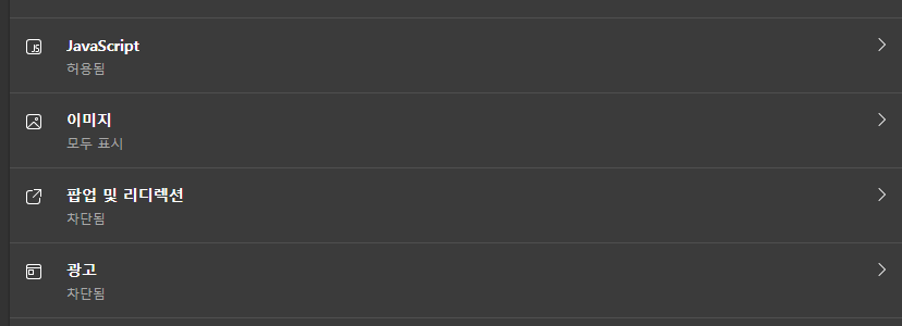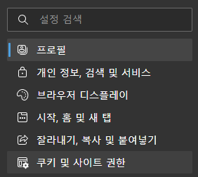 쿠키 및 사이트 권한은 위에서 부터 여섯번째에 있습니다.