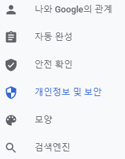 설정페이지로 이동하신 후 왼쪽을 보시면 개인정보 및 보안 메뉴가 있씁니다.