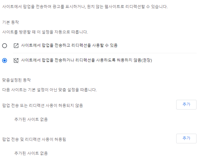 설정을 클릭하신 후 허용된 사이트에 추가를 하시면 추가된 사이트만 팝업차단 해제가 됩니다.