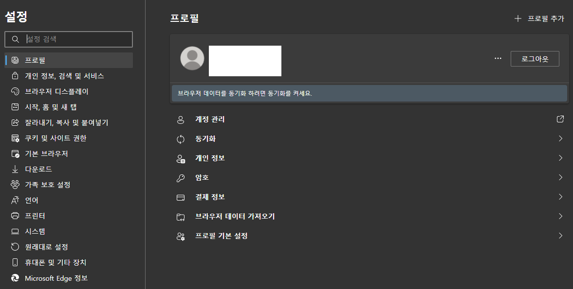 설정 페이지에서 왼쪽을 보시면 프로필, 개인정보, 검색 및 서비스 등이 보입니다.