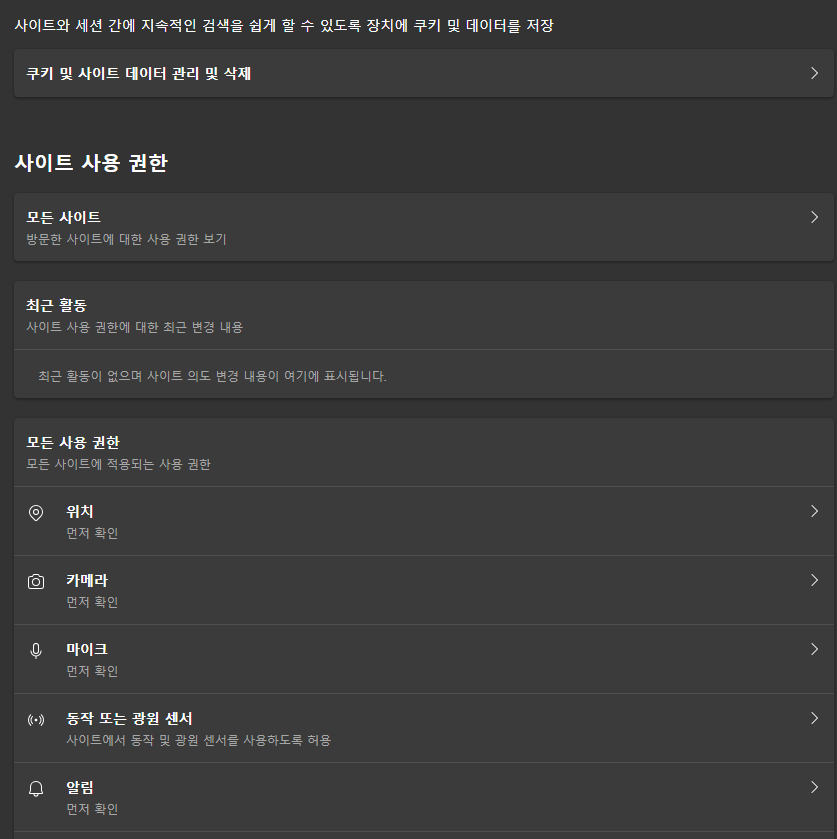 아래쪽에 보이는 사이트 설정을 보시면 위치, 카메라, 팝업 등이 보이실텐데 사이트설정을 클릭하시기 바랍니다.
