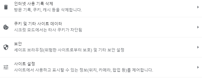 쿠키 및 사이트 권한은 위에서 부터 여섯번째에 있습니다.
