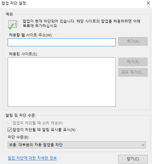 설정을 클릭하신 후 허용된 사이트에 추가를 하시면 추가된 사이트만 팝업차단 해제가 됩니다.