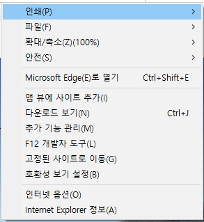메뉴를 클릭신 후 아래쪽에 보이는 인터넷 옵션을 클릭하시기 바랍니다.