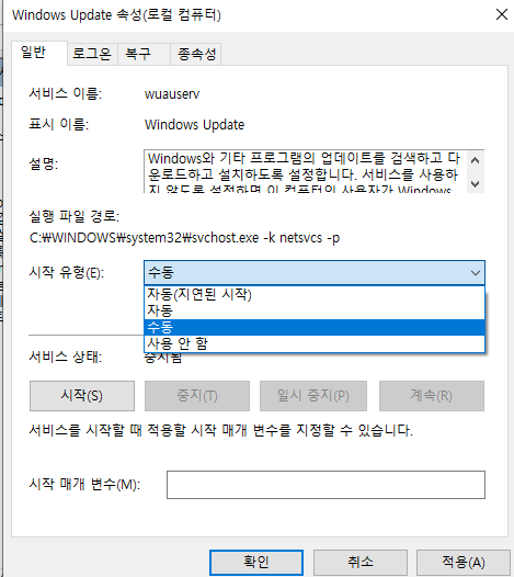 시작 유형을 사용 안함 으로 바꿔 주신 후 적용버튼을 클릭하시면 됩니다.