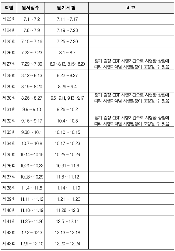 제 23회부터 43회까지 굴삭기운전기능사 필기 시험일정입니다.