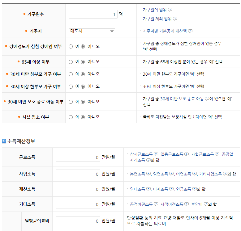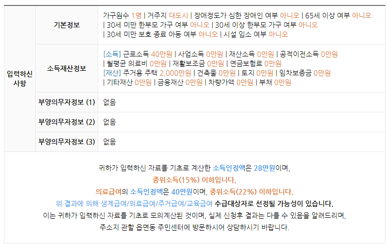 기초생활수급자 생계급여 자격 및 금액을 확인하려면 가구원수, 거주지, 장애여부, 나이, 소득 재산 정보를 정확하게 입력하셔야 됩니다.