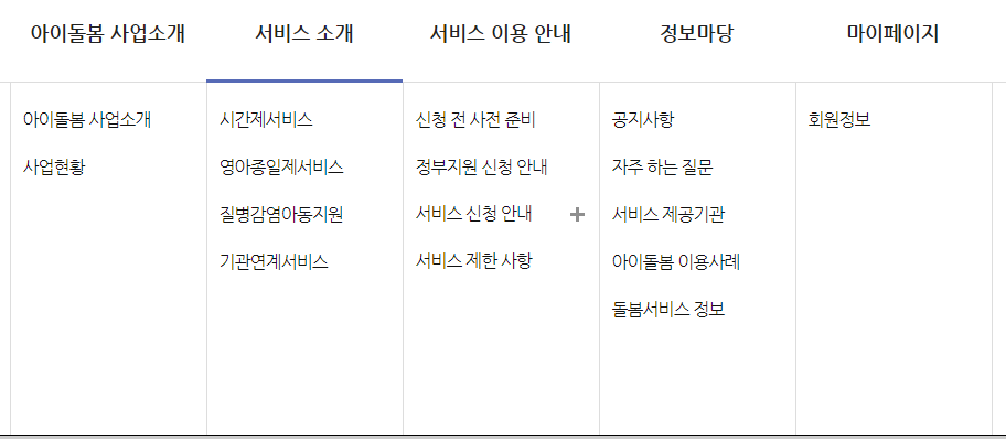 왼쪽부터 아이돌봄 사업소개, 서비스 소개, 서비스 이용안내, 정보 마당, 마이페이지가 있습니다.