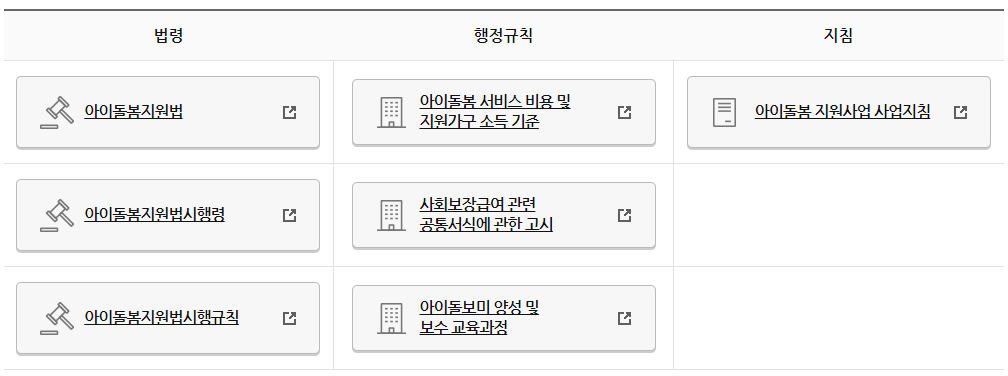 아이돌봄 지원 사업의 법령 및 지침입니다.