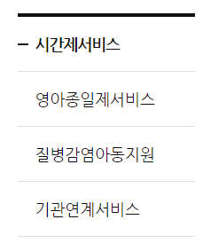 시간제 서비스, 영아 종일제 서비스, 질병감염아동지원, 기관연계서비스가 있습니다.