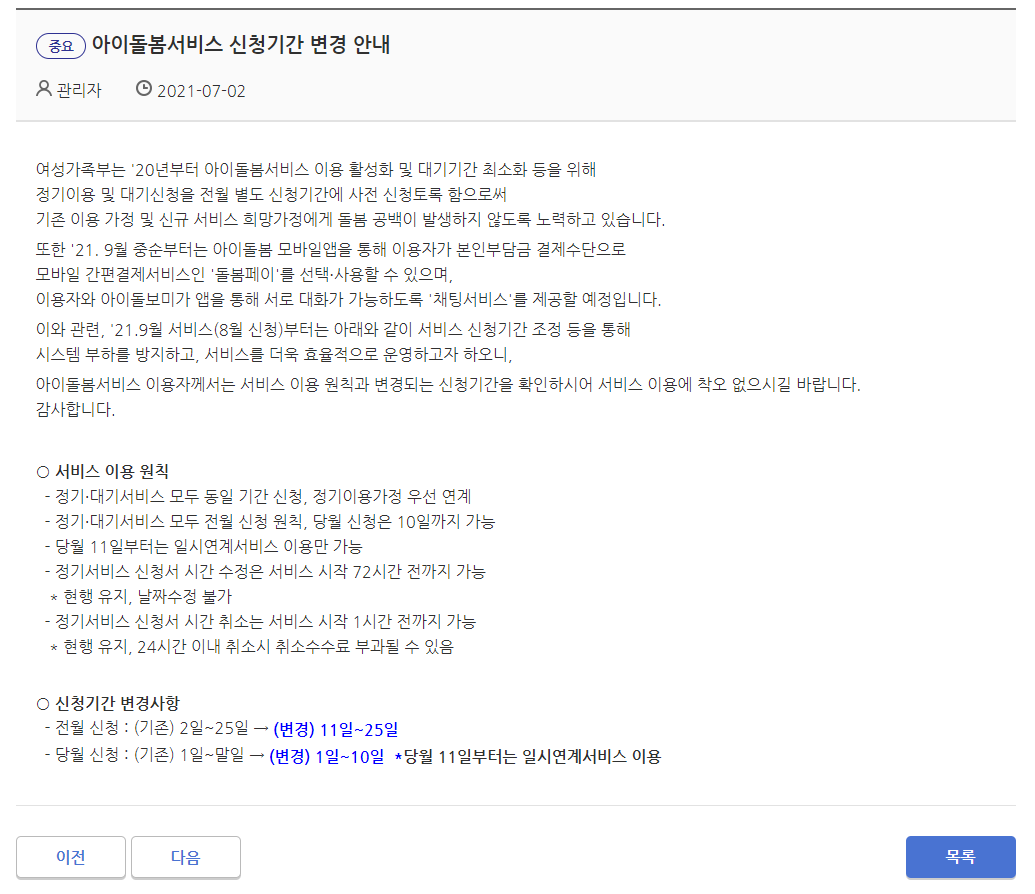 그리고 서비스부터 아이돌봄 서비스 신청기간이 변경된다고 하는데 한번 읽어보겠습니다.