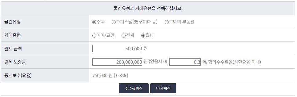 매매/교환이나 전세를 부동산 중개수수료를 쉽게 계산할 수 있지만 월세는 계산하기가 살짝 복잡하기 때문에 계산이 어려우신 분들은 위 부동산 중개수수료 계산기를 이용해보시기 바랍니다.