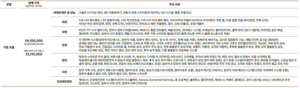 기본모델의 주요 사양은 가솔린 2.5 터보 엔진, 8단 자동변속기, 전동식 파워 스티어링(R-MDPS), ISG 시스템, 통합 주행 모드, 내장은 8인치 TFT LCD 클러스터, 전자식 변속 다이얼(SBW), 제네시스 통합 컨트롤러, 패들쉬프트, 하이패스 시스템, 프레임리스 룸미러(ECM), 블랙 하이그로시 내장재, 터치타입 공조 패널 등, 외관은 Full LED 헤드램프, LED 방향지시등, LED 주간전조등, Full LED 리어 콤비 램프, 245/50R18 피렐리 타이어 & 다이아몬드 컷팅 휠, 이중 접합 차음 유리(앞면, 전체 도어) 등 입니다. 그리고 편의를 위해서 앞좌석 스마트폰 무선 충전, 버튼시동 & 스마트 키, 제네시스 디지털 키, 터치타입 아웃사이드 도어핸들, 전자식파워 차일드 락, 레인 센서, 열선 & 전동식 조절 스티어링 휠, 독립제어 풀오토 에어컨(운전석 & 동승석 듀얼 풍향모드 제어, 후석 공조 전석 제어, 오토디포그, 외부공기 유입 방지 제어 포함), 공기 청정 시스템(미세먼지 센서, 엔진룸 프리필터, 고성능 항균 & 콤비 필터), 조향 연동 후방 모니터, 전동식 파킹 브레이크(오토홀드 포함), 앞좌석 & 뒷좌석 파워 세이프티 윈도우, 전방/후방 주차 거리 경고, 스마트 전동식 트렁크, 타이어 응급 처치 키트가 장착되어 있습니다.