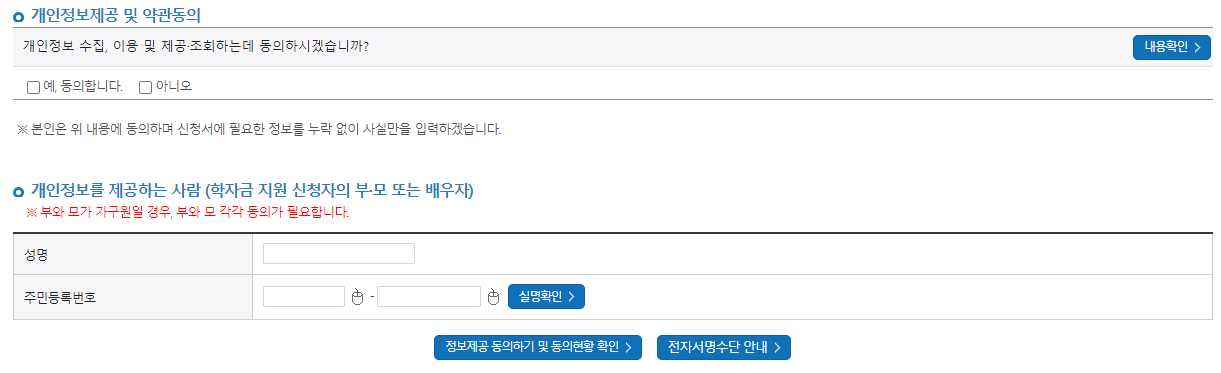 한국장학재단 홈페이지에 처음 접속하셔서 회원가입을 하셨다면 가구원 정보제공 동의를 해주셔야 합니다.