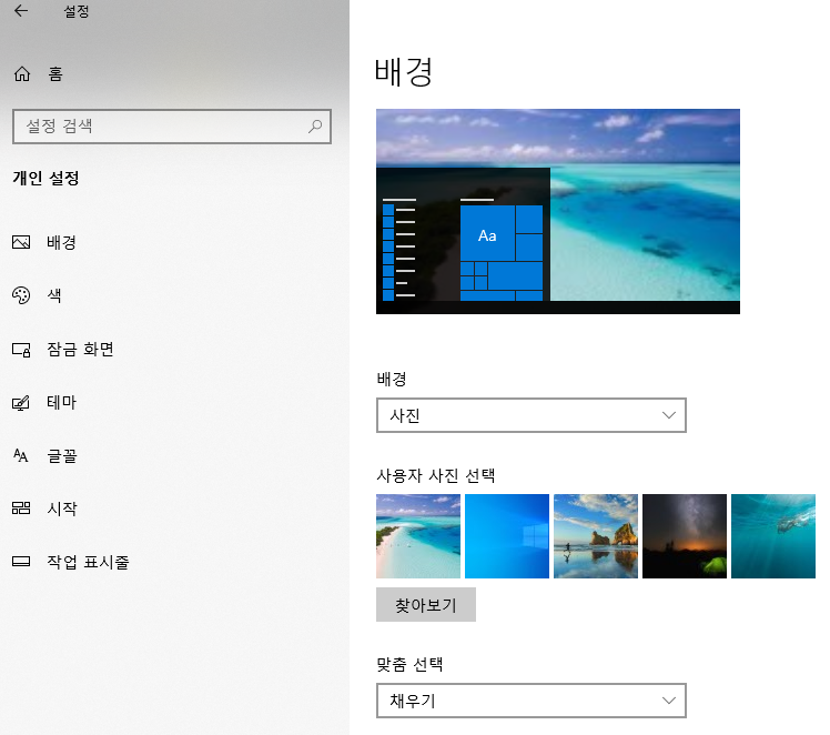 개인 설정을 클릭하시면 배경, 색, 잠금화면, 테마, 글꼴, 시작, 작업표시줄이 나오게 됩니다.