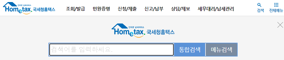 국세청 홈택스 홈페이지에 방문하셔서 이용하려는 서비스가 보이지 않는다면 검색을 이용하시기 바랍니다.