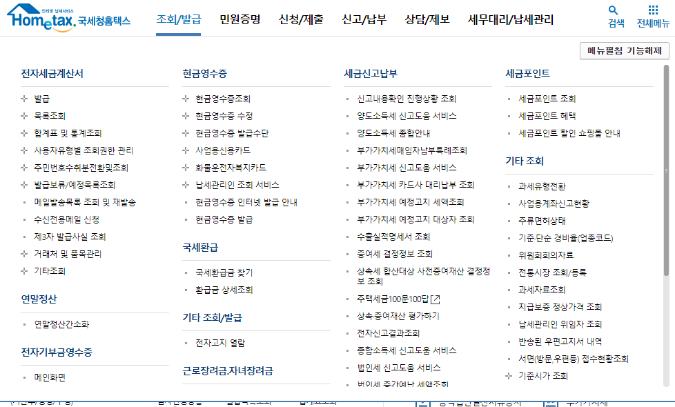 국세청 홈택스에서는 연말정산, 전사세금계산서, 현금 영수증 등 다양한 서비스들을 제공하고 있습니다.
