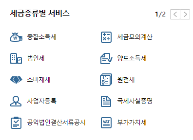 각각 클릭하시면 세금에 대한 설명, 납부, 신고 등을 하실 수 있고 세금 종류별 서비스 역시 오른쪽 상단에 버튼이 있어서 2페이지로 넘어가실 수 있습니다.