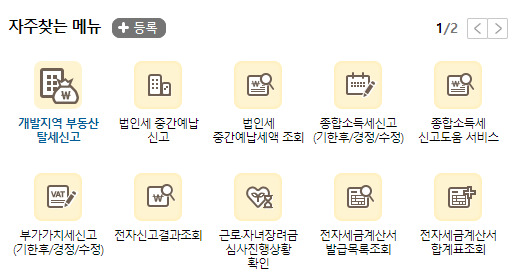 자주찾는 메뉴를 보시면 여러가지가 보이실텐데 국세청 홈택스 홈페이지에 방문하시는 사용자들이 자주 찾는 메뉴들이 있는데 오른쪽 상단에 화사표가 있어서 두번째 페이지로 넘기실 수가 있습니다.